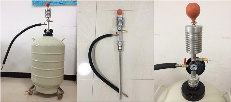 該產品依靠操作者手捏吸液球(ZYB-5型),使液氮容器內貯存的液氮少量產生氣化。由于液氮的氣液體積比較大,氣化后的氮氣在密封的容器內對盛裝的液氮增壓,促使容器內盛裝的液氮排放出來,達到對其它容器補充液氮的目的。它具有操作方便可靠、排液過程中液氮的蒸發損失低的優點。